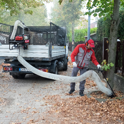 • Trabalhador usa máquina recolhedora de folhas junto a carrinha branca numa rua com folhas no chão
