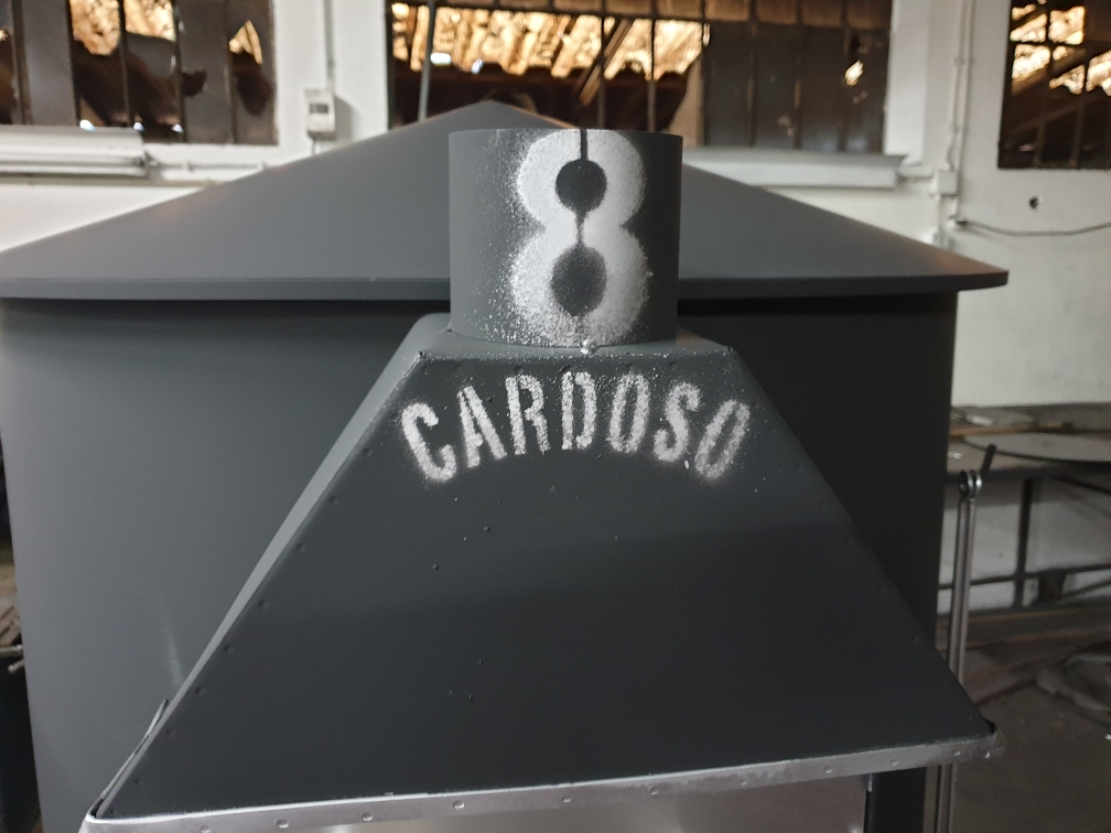 • Chaminé metálica cinza escuro com texto branco 8 CARDOSO em ambiente industrial