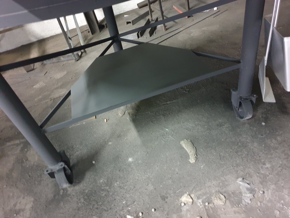 • Base metálica cinza escuro com rodas sobre chão de cimento