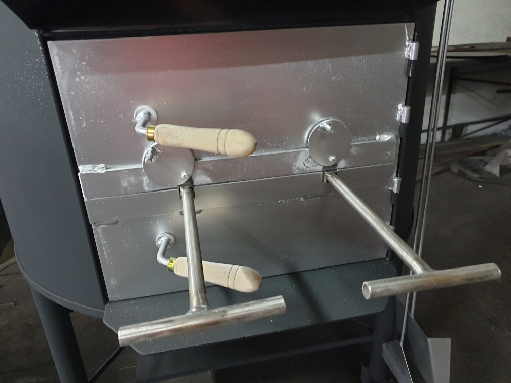 • Forno de metal preto com porta de aço e alavancas com cabos de madeira
