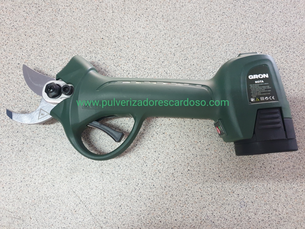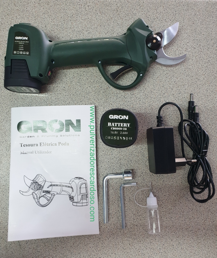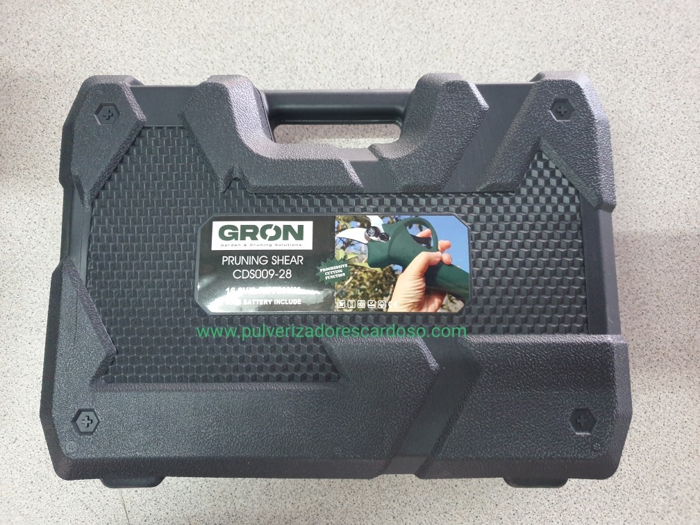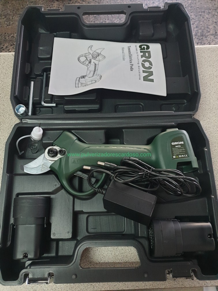 Tesoura GRON28 C/2 Baterias 250,00 € Desconto de %. IVA incluído. Partilhar Comprar Contactar Tesoura de Poda Com 2 Baterias Marca: GRON Modelo: 28 Bateria Litio: 2.6AH Voltagem: 16,8V Tensão Carga: CA 110V - 220V Diâmetro Corte: 25mm Tempo Carga: 1-1,5 H Autonomía: 7-9 Horas (2 Baterias) Potência Nominal: 100W Potência Maxima: 500W Sistema Protecção Único e Patenteado Sensor de Corte (caso aproxime os dedos da lamina, não corta) 2 Modos de Corte (abertura total ou meia abertura) Ligeira, Rápida e Potente Peso: 955g Inclui: 2 Baterias 1 Carregador (carrega duas baterias em simultâneo) 1 Kit Ferramentas 1 Mala de Transporte 1 Manual Instruções Marca GRON Características