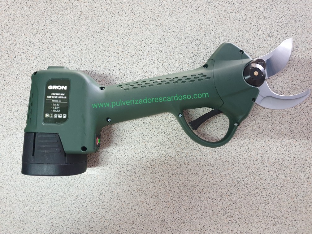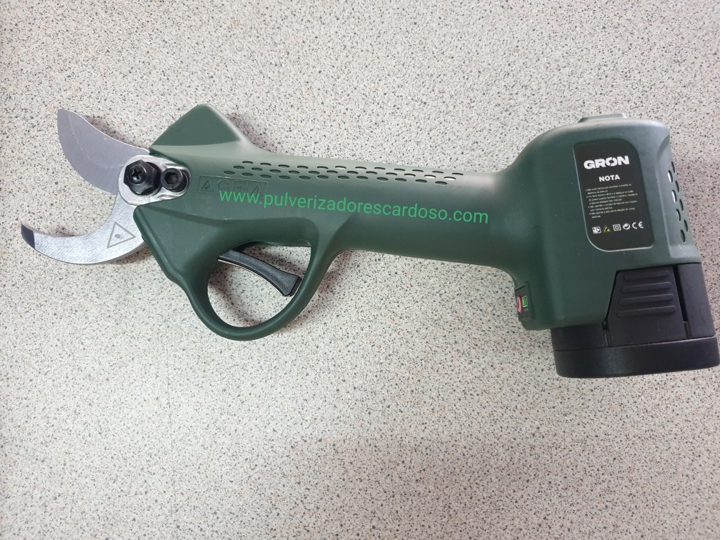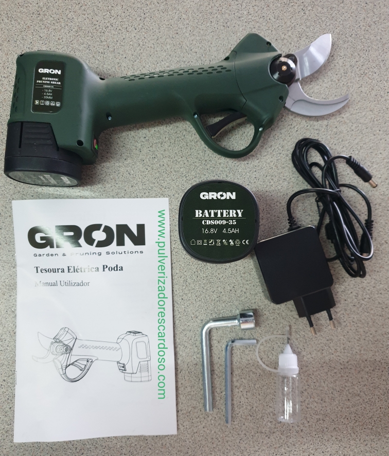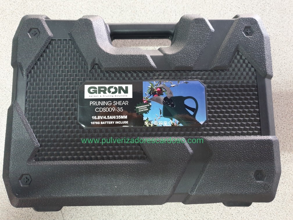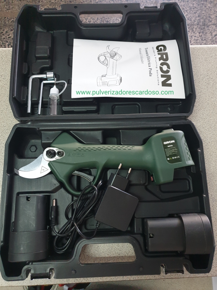 Tesoura GRON35 C/2 Baterias 350,00 € Desconto de %. IVA incluído. Partilhar Comprar Contactar Tesoura de Poda Com 2 Baterias Marca: GRON Modelo: 28 Bateria Litio: 4.5AH Voltagem: 16,8V Tensão Carga: CA 110V - 220V Diâmetro Corte: 35mm Tempo Carga: 2-2,5 H Autonomía: 8-10 Horas (2 Baterias) Potência Nominal: 100W Potência Maxima: 500W Sistema Protecção Único e Patenteado Sensor de Corte (caso aproxime os dedos da lamina, não corta) 2 Modos de Corte (abertura total ou meia abertura) Ligeira, Rápida e Potente Peso: 1250g Inclui: 2 Baterias 1 Carregador (carrega duas baterias em simultâneo) 1 Kit Ferramentas 1 Mala de Transporte 1 Manual Instruções Marca GRON Características