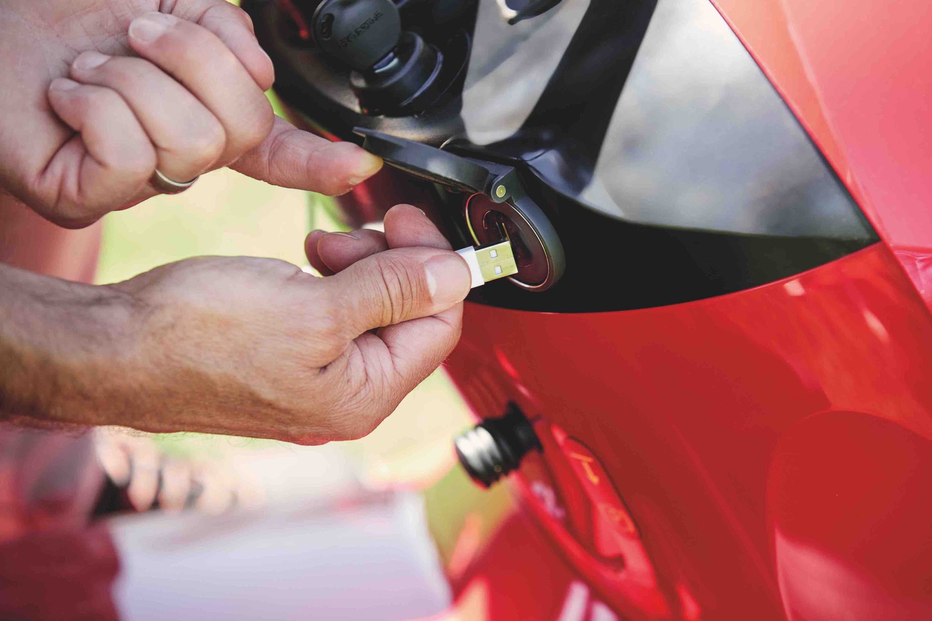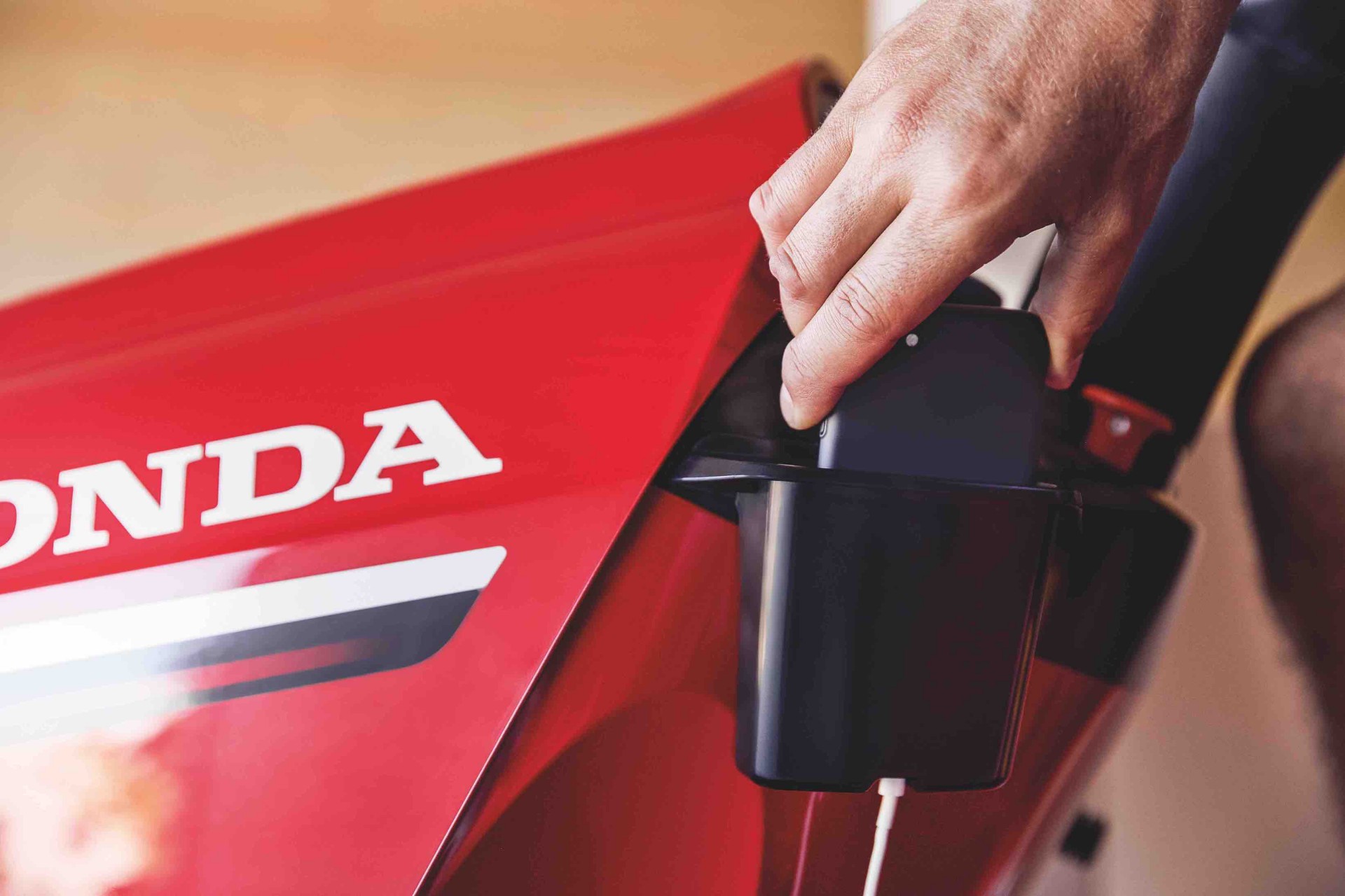• Mão a colocar telemóvel em suporte preto numa mota Honda vermelha
